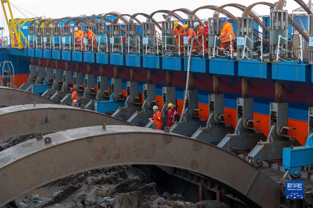 這是一個全新的打撈解決方案,創造性地融合了核電弧形梁加工工藝、隧道盾構掘進工藝、沉管隧道對接工藝,并運用液壓同步提升技術、綜合監控系統等目前全球最為先進的高新技術。22根巨大的弧形梁,將逐根從古船下方穿引過去,并相互鑲嵌在一起,組成一個長51米、寬19米、半徑9米的半圓柱體沉箱,把古船及周圍泥沙、海水“滴水不漏”地包裹起來,總重近萬噸。此外,為了平穩安全提升弧形梁形成的沉箱并順利將其護送至船塢,還設計并建造了專用打撈工程船“奮力輪”?!皧^力輪”主尺度長130米,寬34米,型深9米,設計吃水6米,兩端設有同步提升裝置,在船中部開口,自帶一個長56米、寬20米的月池。穿梁完成后的弧形梁沉箱裝載著古船直接由“奮力輪”從海底提升至中部月池,并轉運、卸載至船塢。
