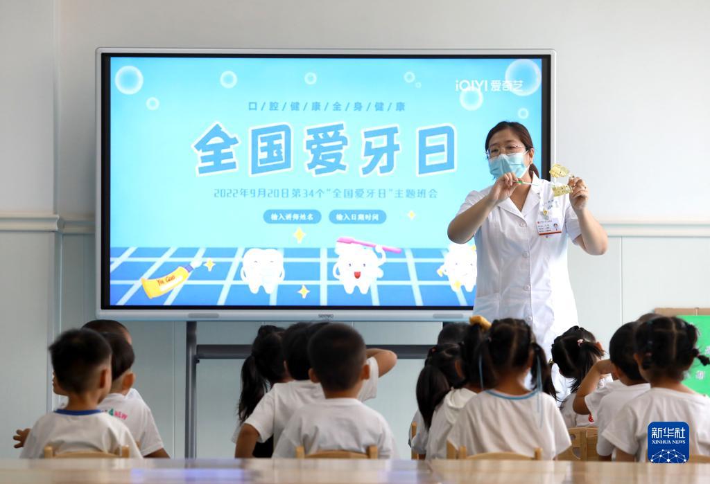 9月19日,在河北省石家莊市井陘礦區橫澗鄉天護幼兒園,醫務人員為孩子們講解牙齒保健知識和正確的刷牙方式。新華社發(梁子棟 攝)